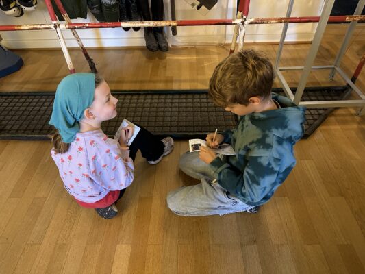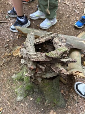 Am Dienstag haben wir uns mit den Vögeln beschäftigt. Mit einem Fernglas haben wir in den Baumwipfeln nach ihnen Ausschau gehalten und den Kleiber und eine Blaumeise gesehen. Den Specht haben wir nur gehört. Anschließend haben wir uns einen Partner gesucht und