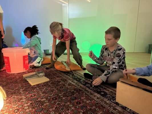 haben mit verschiedenen Instrumenten und Gegenständen Musik gemacht. Wir hatten Plastikeimer, Stimmgabel,