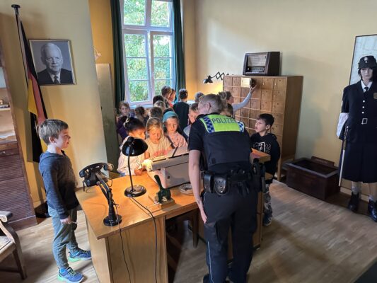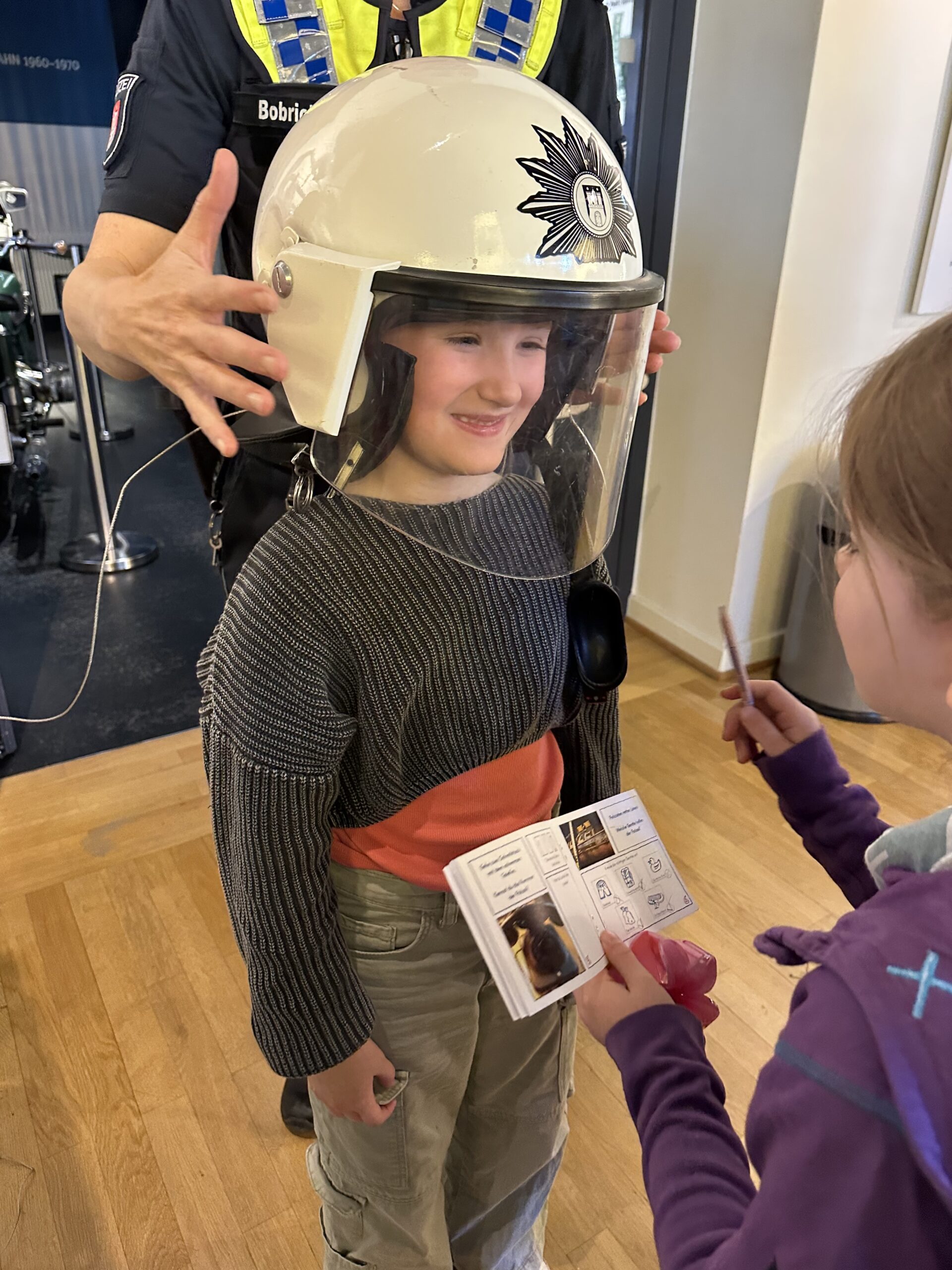 Fluge vorbei. Im Museum sahen wir Uniformen, verschiedene Handschellen, durften Einsatzhelme aufsetzen und in einer nachgebauten Wache spielen. Sogar in eine Gefängniszelle konnten wir uns einsperren lassen. Am Ende bekam jeder einen Polizei-Ausweis. Das war ein toller Ausflug!